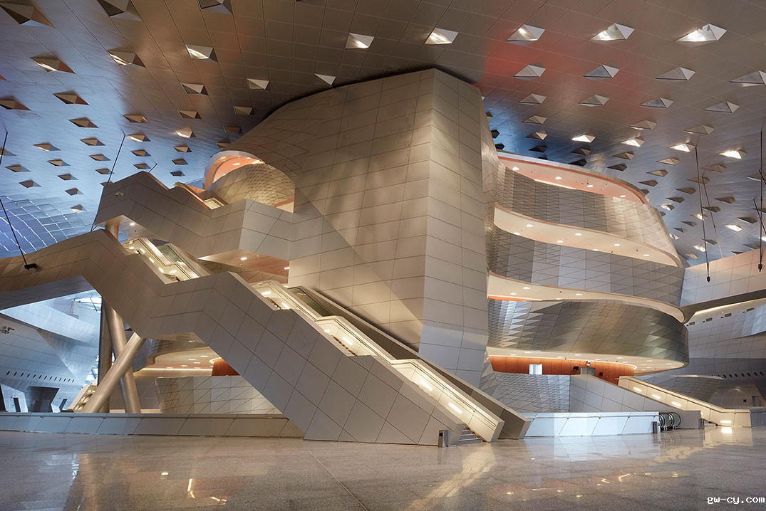 从项目开工伊始就吸引着社会各界关注的目光,但异型的内部空间让施工难度超乎想象。大连国际会议中心整体结构可概括为“两大三多”,即大悬挑、大跨度,不管是内层的玻璃幕墙,还是外层的铝板装饰飘带,都复杂无规律,导致施工方和设计方都倍感压力。考虑到双方在施工方面的苦恼,我们更加积极主动地为了实现更好的落地效果而配合。
