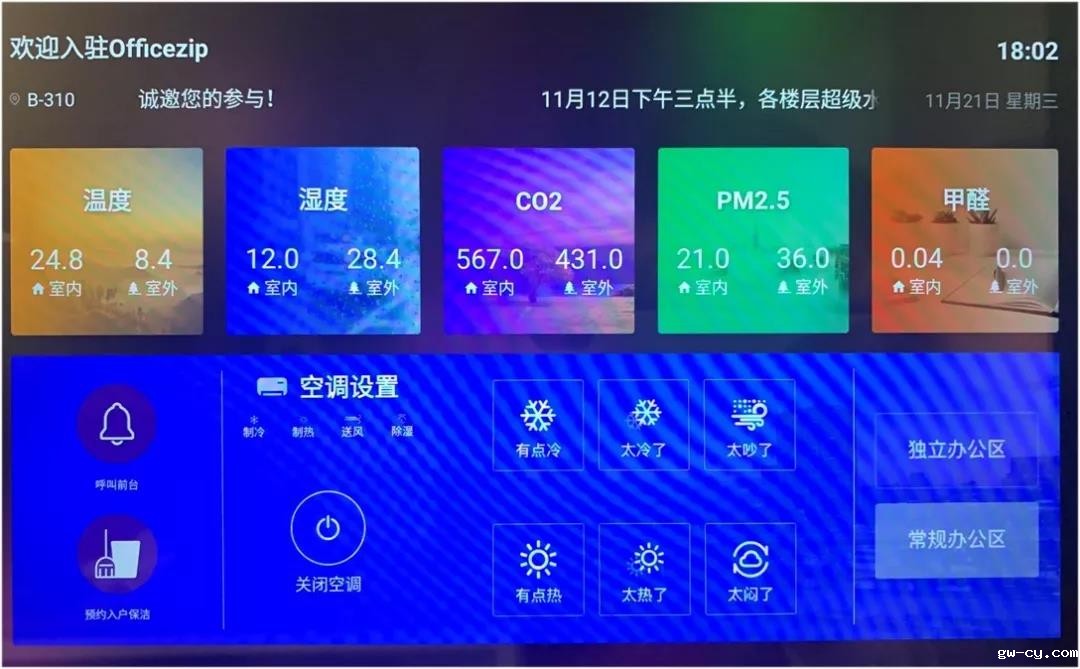 透过自主控制热舒适参数的智能化模块,确保所有建筑用户获得最大程度的热舒适。提供直观的用户界面,点击“有点冷”、“太冷了”、“有点热”、“太热了”来控制在室内温度;点击“太吵了”,空调风速会降低;监控面板右侧的“独立办公区”与“常规办公区”按钮可用来分别控制个别空间的空调。