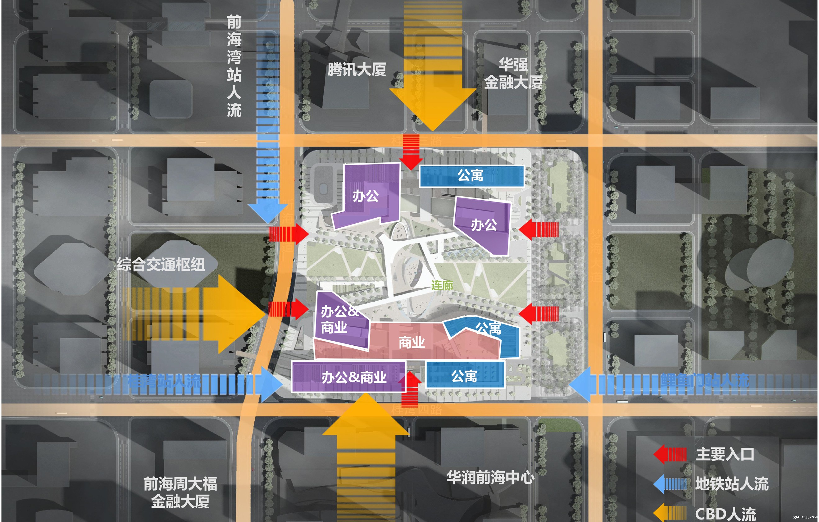 建筑设计以“微型城市”设计理念,围合为个性卓越、整体协调的建筑形态,结合前海整体地下空间规划,创造立体复合、生机勃勃的地下空间网络,建立高效立体的交通系统,绿色、智能的低碳生态街区,塑造创新多元功能复合的金融产业街区。