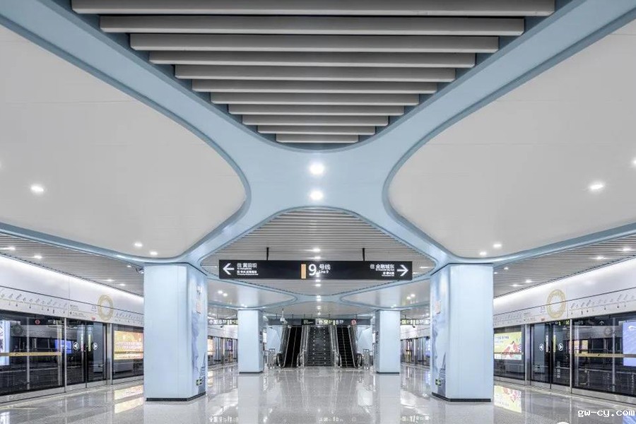 成都地铁18号线是服务于成都市区和成都天府国际机场之间的快线,也是西南首条5G地铁。“5G领先”已经成为成都市发展的一张崭新名片,J&A采用空间一体化打造手法,以“世界窗口·魅力川蜀”为装修主题,融合对天花、墙面、柱面、地面空间的整体构思,营造出流畅、舒适的建筑装饰艺术氛围。