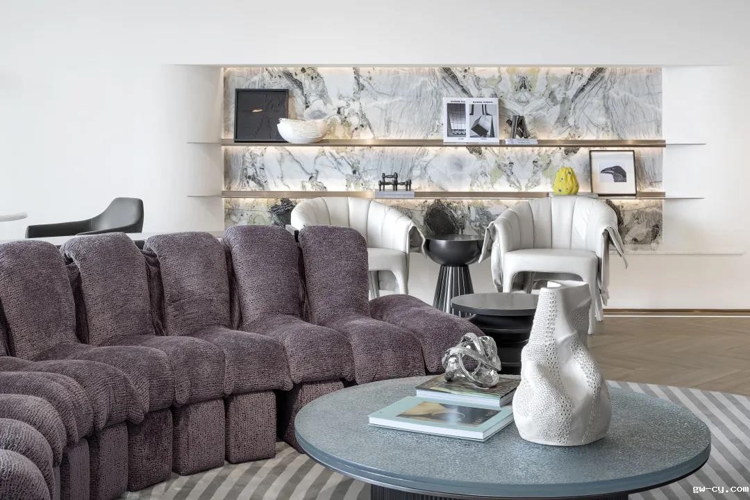 主要材料:肌理漆、白纹板石材、木饰面、古铜金属
