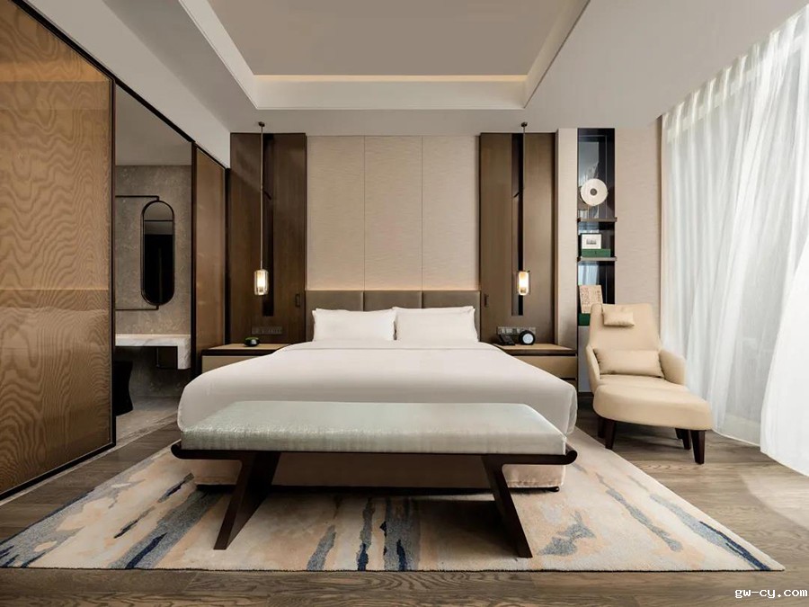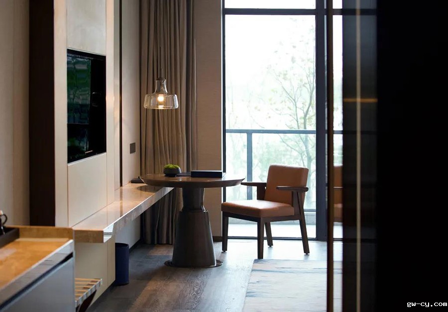 客房设计上,J&A力求为客人营造一种能静心放松的空间体验,用材方面尽量采用木材、皮革、麻质面料等体现出天然质感的材质以及质朴的色调,让空间既有家的温馨又有工作的严谨,充满典雅、明净、柔和的生活气息。栖于湖畔,在婉转的鸟语啁啾与湖水拍岸中醒来,窗外是树影摇曳,水波荡漾。