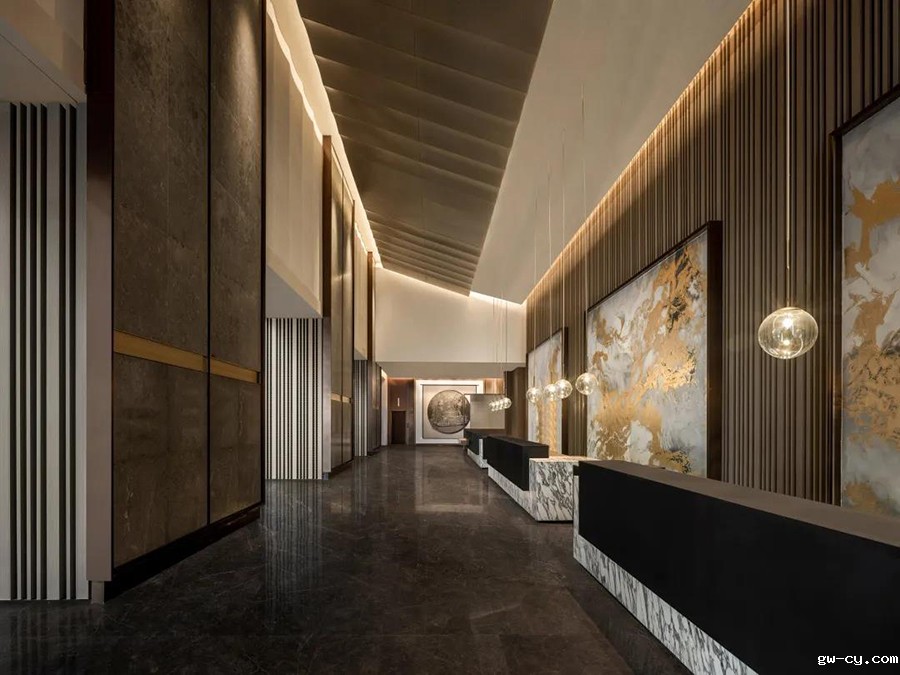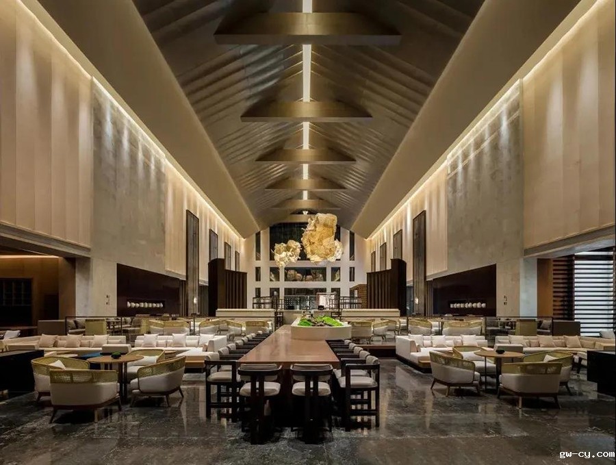 大堂接待空间采用屋脊起伏的几何体天花,围合的艺术装饰屏风为背景,使空间错落层迭,以点、线、面的交织布局,于山水城共融的环境中构筑一种不取繁饰、虚实穿插的视觉体验。