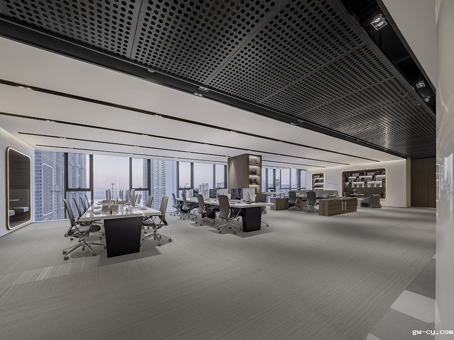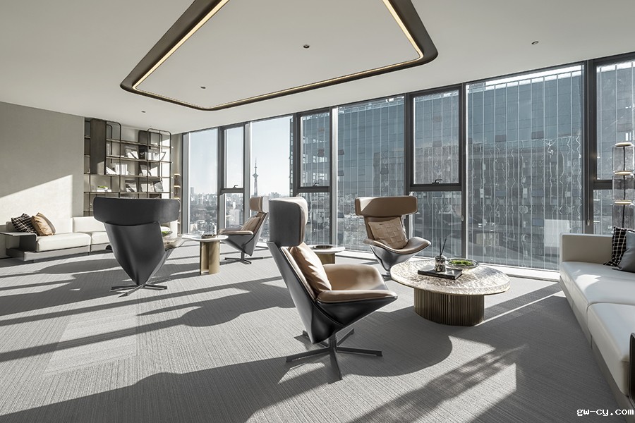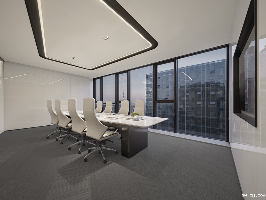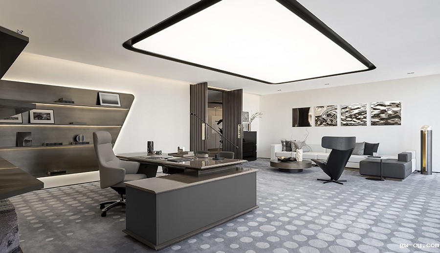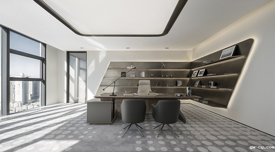 总裁室延续整体空间的色调和风格,通透明亮,开阔的视野和格局,现代简约的设计语言,营造出沉稳内敛的商务氛围,温润雅致的空间意境。