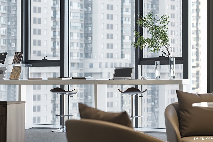 提炼中性干练的线条,开放式办公空间呈现出自然、通畅的氛围。大面积的玻璃窗拓宽了视觉感受,一线江景如画卷展开。
