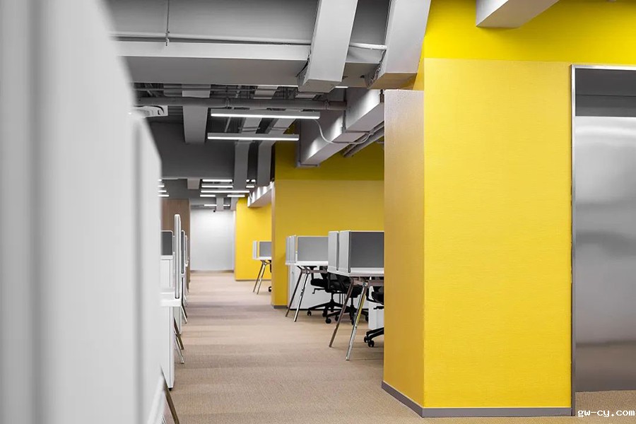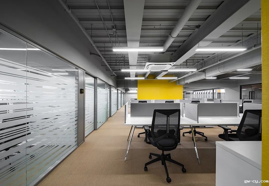 自用办公区风格也以简约为主,开放式吊顶与大面积的暖灰色运用,局部添加logo的明黄色让空间更有活力。