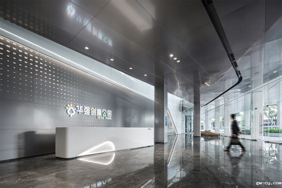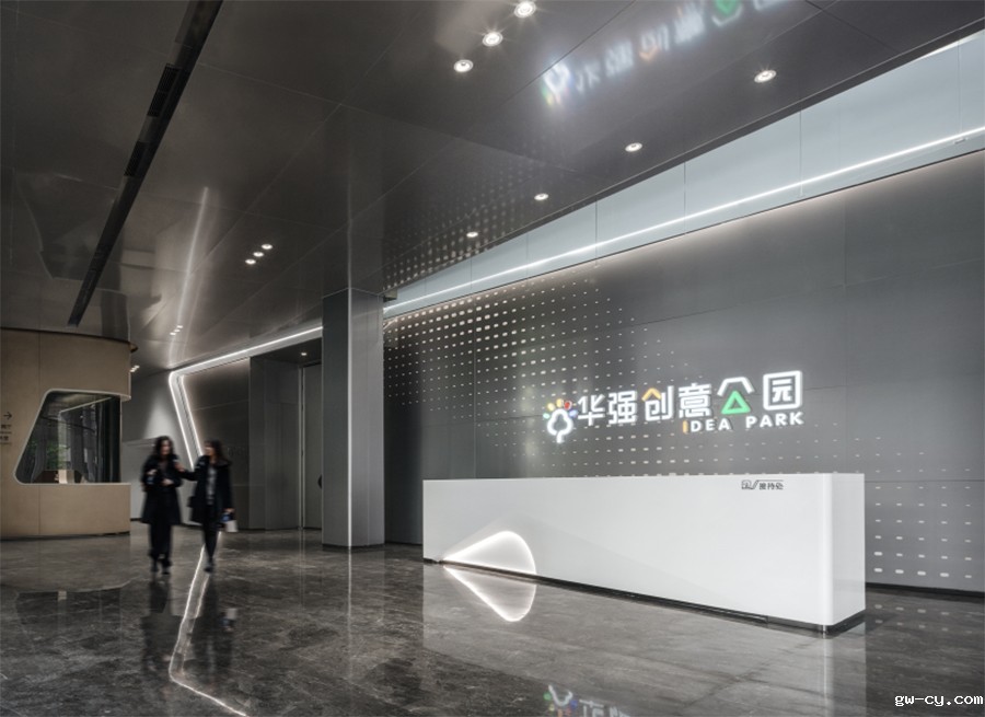接待大厅大面积采用金属色,塑造出一个灰色空间,体现科技氛围。色彩上通过材质的深浅变化,营造丰富的空间层次,形成无限的拉伸感。