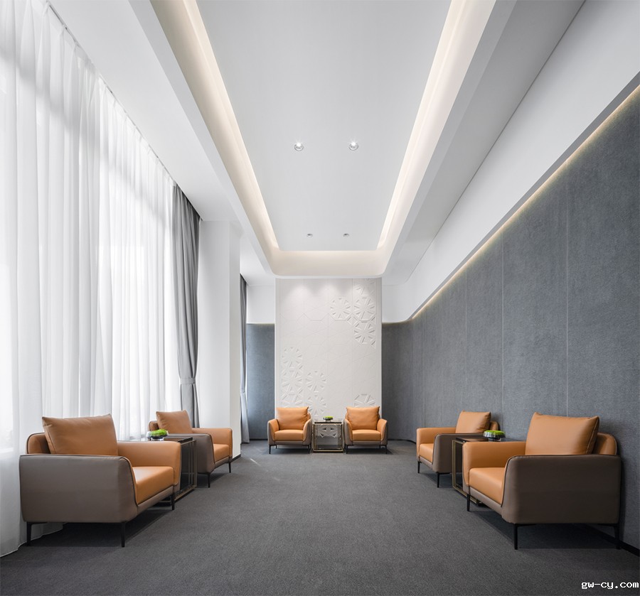 VIP接待室采用白色无机材料和灰色墙布,打造成典雅、舒适且具有设计感的接待空间,满足不同客户的需求。