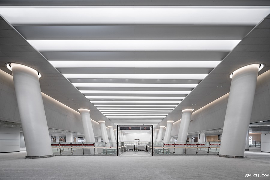 天窗的遮光百叶设计为“控光大师”,百叶格栅采用特殊角度及造型,调节昼夜光线,缓解空间内温度压力,实现节能减排。枢纽整体装修风格统一,材料选择上突显自然肌理的同时,展现建筑、室内空间一体化的设计语言。
