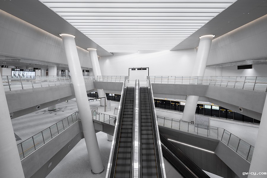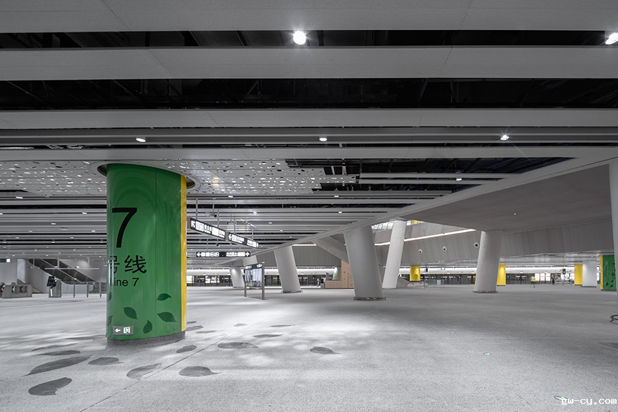 以“阳光+树荫下的幸福生活”为主题,黄木岗枢纽将阳光、绿植引入地下,形态丰富、错落有致的中庭和自然采光,让原本压抑的地下空间变得开阔、明亮。纯粹、极简、自然的风格,给人舒适的出行体验。