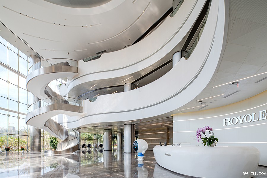 柔宇科技总部位于深圳龙岗区坪地街道,建筑外观呈圆润流线型,像一艘刚着陆的宇宙飞船。立足柔宇科技的企业内涵和战略精神,同时延续建筑的曲线元素,J&A将柔宇产品元素与空间形态结合,创造出一个独特的“柔性星球”。