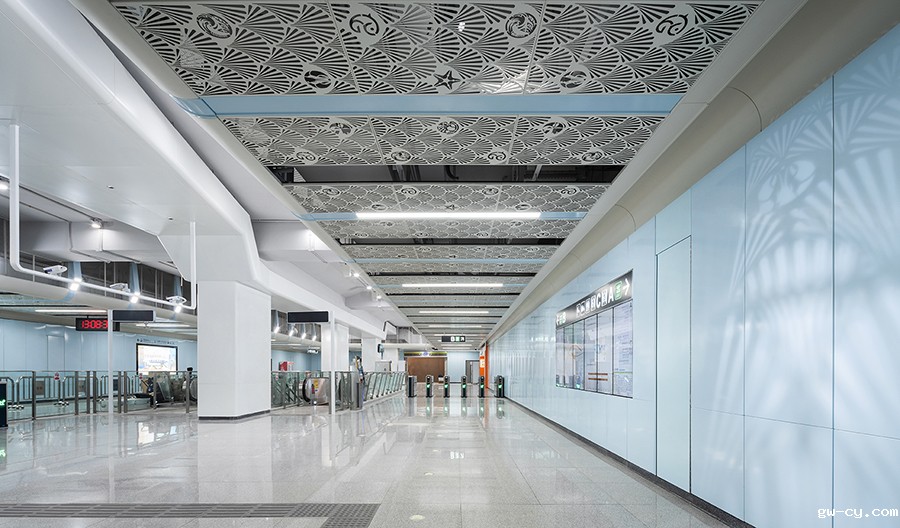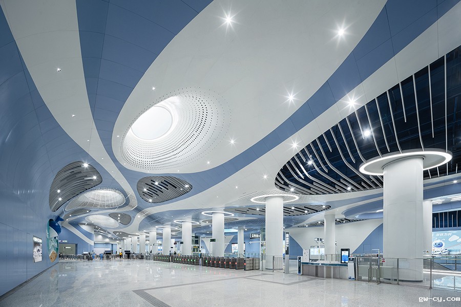 车站两侧天花结合海洋生物造型元素与色彩,结合镂空剪影设计,灯光投射在墙面上,创造出如同阳光洒落海面的虚实光影效果。