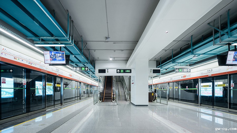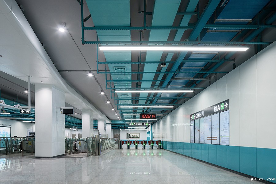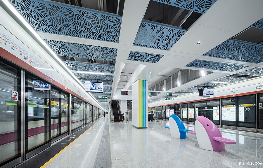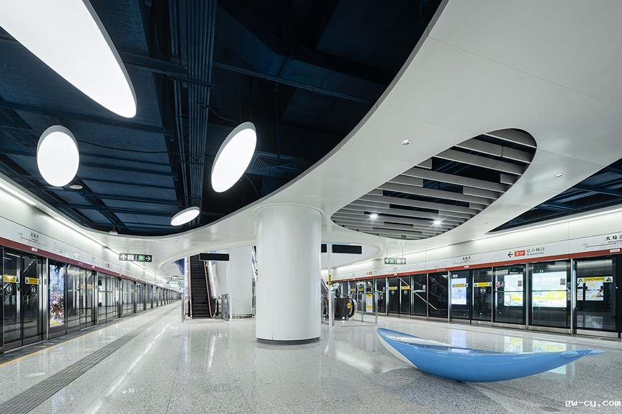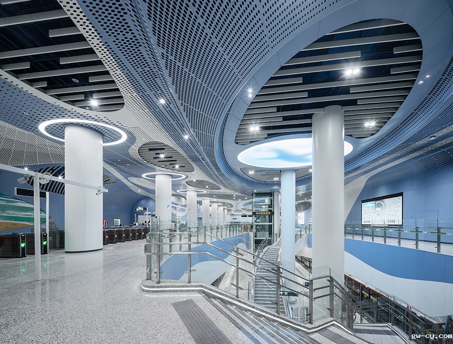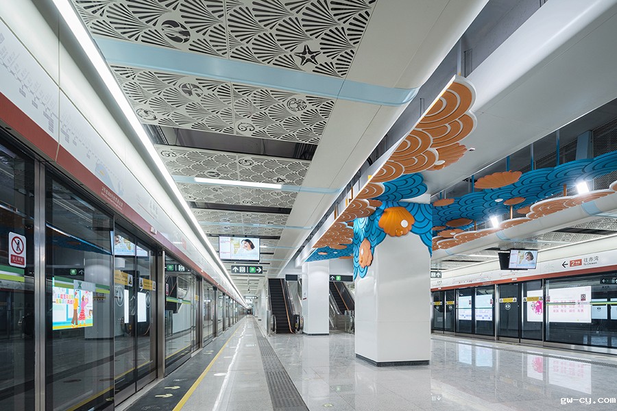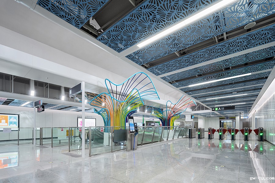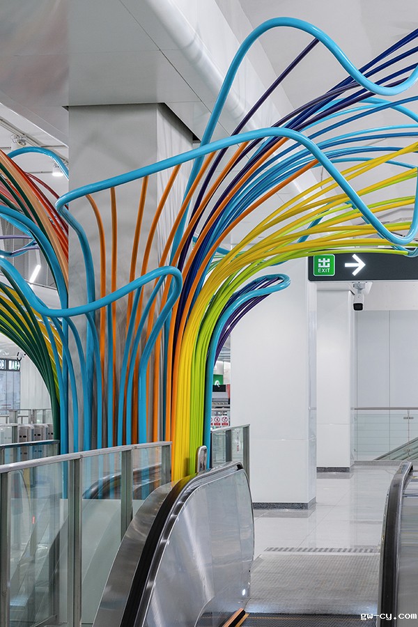 车站两侧天花结合海洋生物的造型元素与色彩,楼扶梯中央七彩珊瑚形态艺术造型柱成为车站的视觉焦点。
