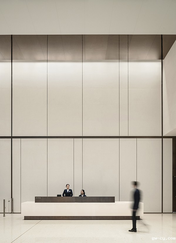 大堂空间简明的线条代替多余的修饰,打造富有秩序感的高品质大堂。主立面提取“后母戊鼎”鼎身的十字错拼图案划分石材分块,在整体性中跃动细节韵律的美感。