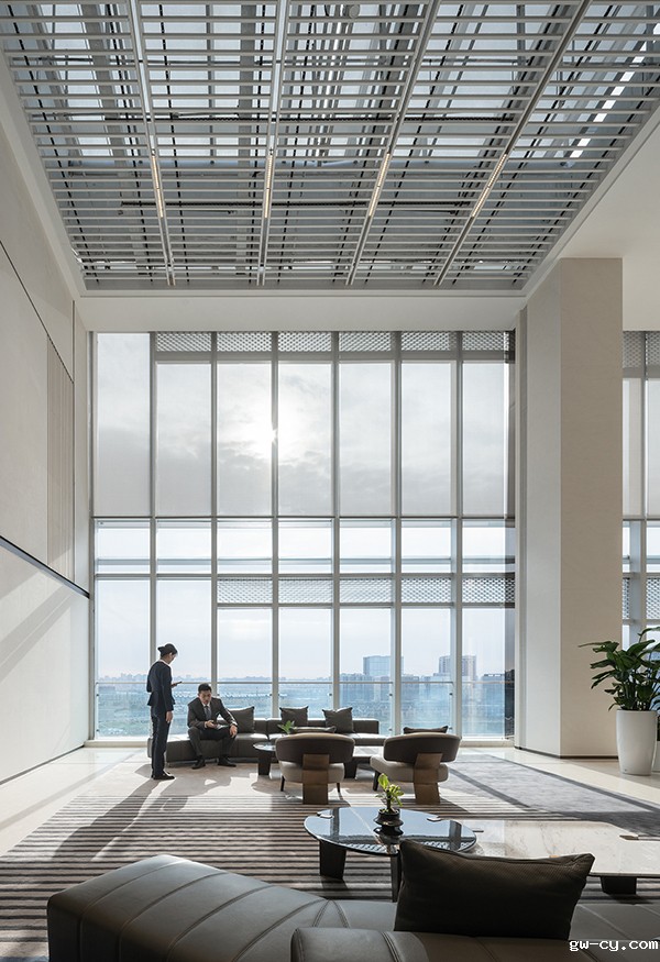灯光设计延续室内设计“窗”的核心理念,采用不同色温塑造办公楼的空间功能,大堂区域采用日光感应不同外部天气与时间变化来设置不同模式。标准过道、会议室、培训室等区域通过智能场景照明控制,实现不同时段的照明功能和氛围需求,兼顾灵活性与实用性。