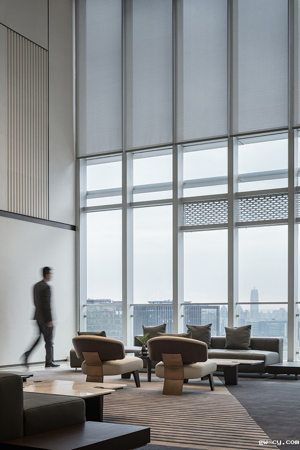 设计团队打破传统金融行业的平面模式,采用ABW混合办公形式。利用玻璃隔断划分不同的工作区域,既保持空间的开放感,又不失隐私性。