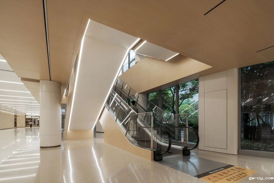 大堂内部利用自然光、生态材料以及与树叶相关的色彩和形状,营造出一种温馨而舒适的氛围。