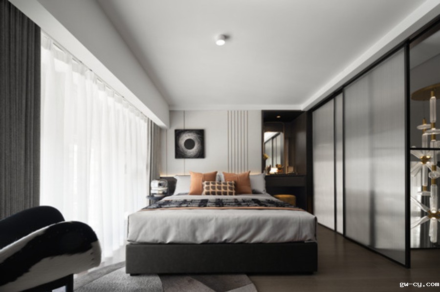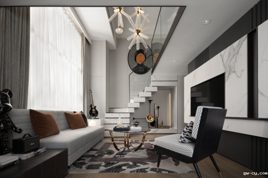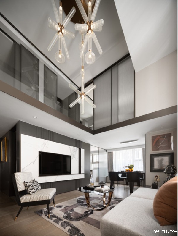 金属、玻璃、石材、木饰面增加层次感。肌理感的材质与光泽感的金属形成碰撞,营造室内高级艺术感。