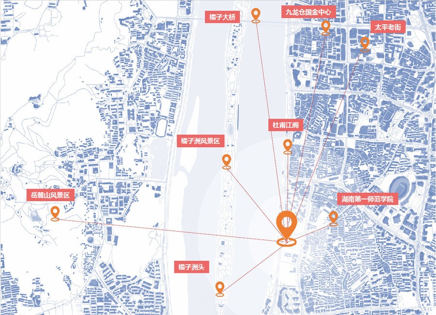 通过分析,办公大楼基地西侧及东侧视野范围较好,包括“四羊方尊”主题景观轴、橘子洲头、湘江风光带、岳麓山等具有代表性的景观资源都在基地视线可及的范围内。
