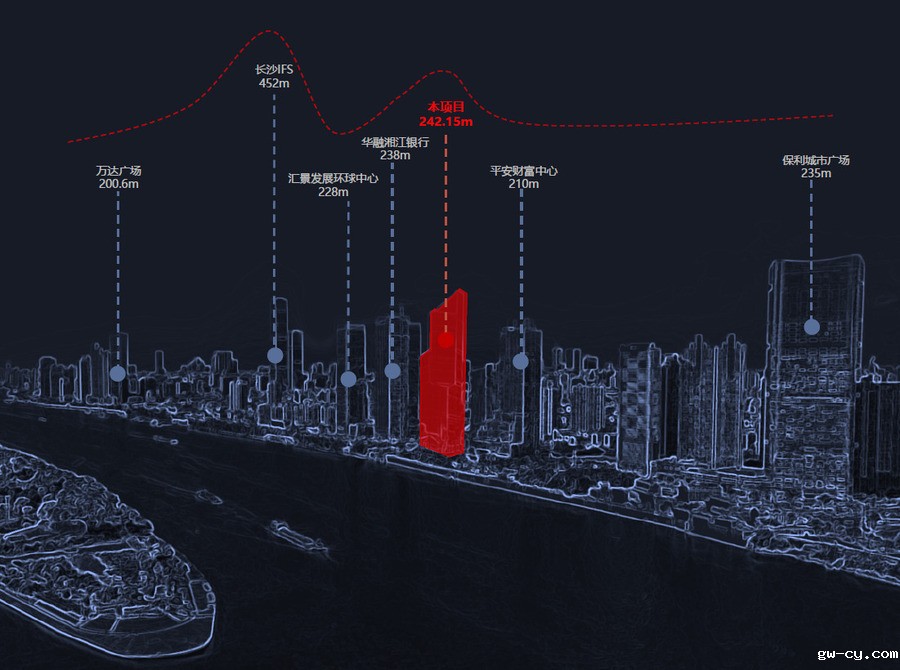 周边相邻建筑高度均200米左右,区域形成较高的城市天际形象,天际轮廓沿江由低到高,于本案达到最高处再平缓下降,整体天际线平缓优美,沿江视觉舒适自然。