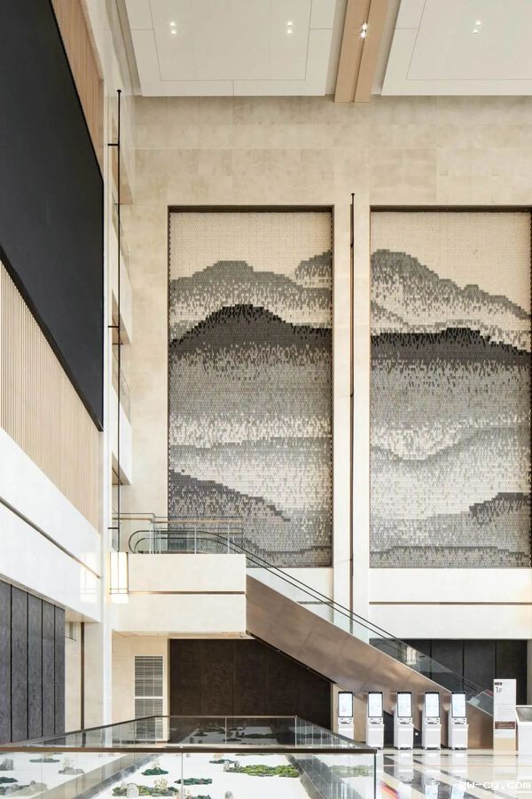 主大堂两侧借鉴中国传统画九重山的形态,连绵起伏的山脉展现出沉稳宽厚的气质,宛如中医所追求的人体脉象的平和与稳健。