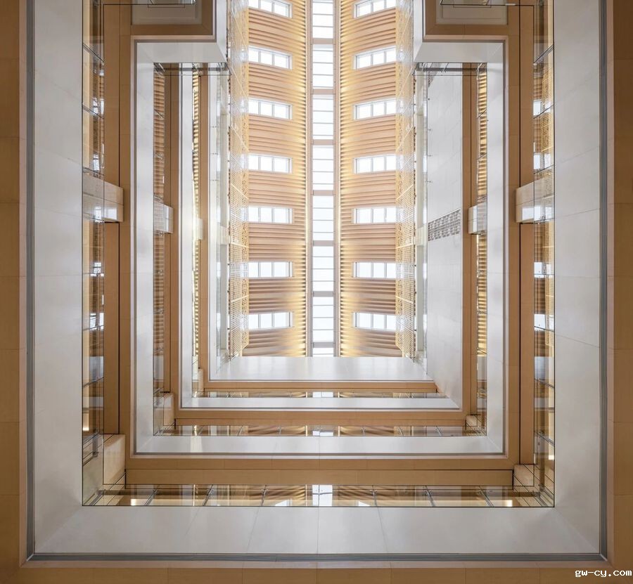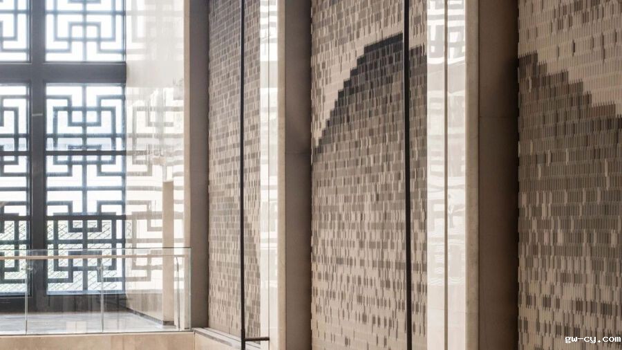 中庭两侧,垂直而下的格扇通花借由光线与“屏”的微妙变化,使自然光层叠洒落,透露出温柔的美感。同时,这一设计极大地节省了照明能耗,是绿色设计的杰出典范。