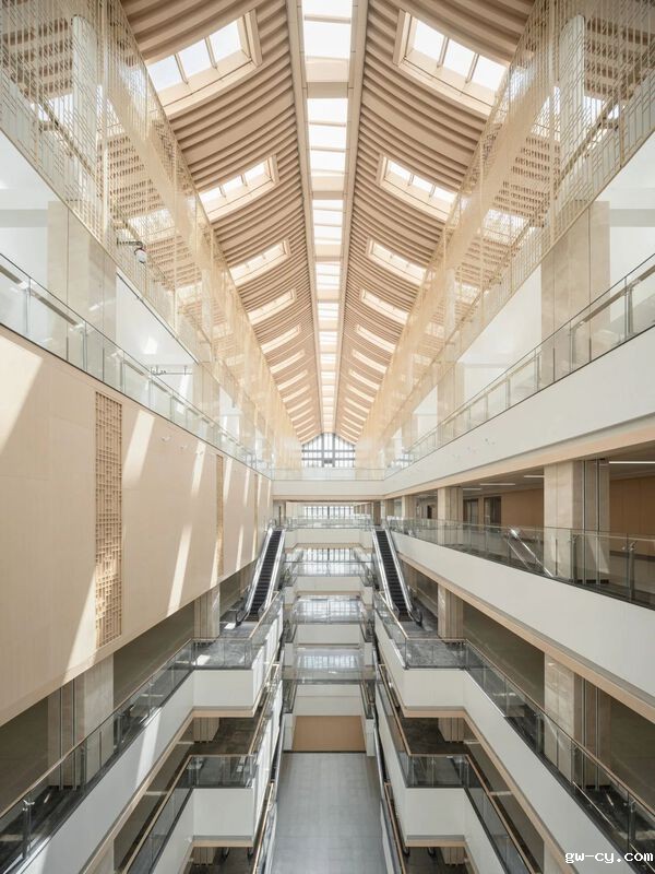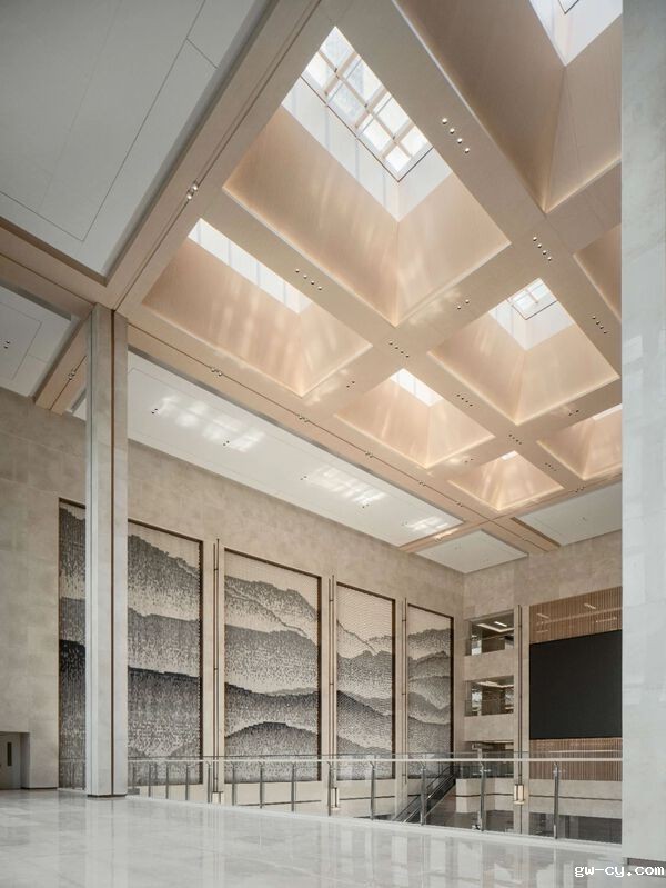 天窗的形状取材自中医“药柜”,其整体采纳了九宫格的设计方案。阳光透过这的天窗铺满大厅,整齐规整里,含蓄地透露着典雅的格调。