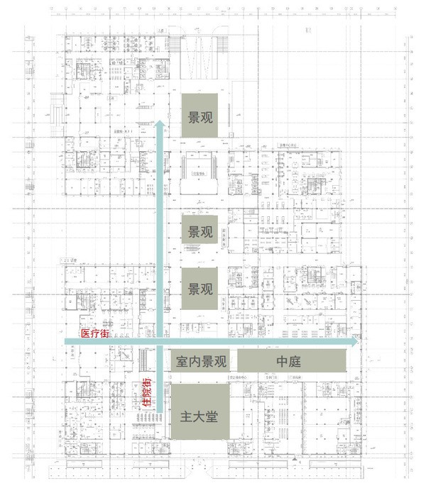 其中,医疗街组织门急诊和医技功能,设置架空广场、中庭、自助服务、健康讲堂、庭院等功能设施;住院街组织住院、医养康复等功能,设置庭院式主入口、门诊大厅、艺术画廊、中医大讲坛、庭院等空间。