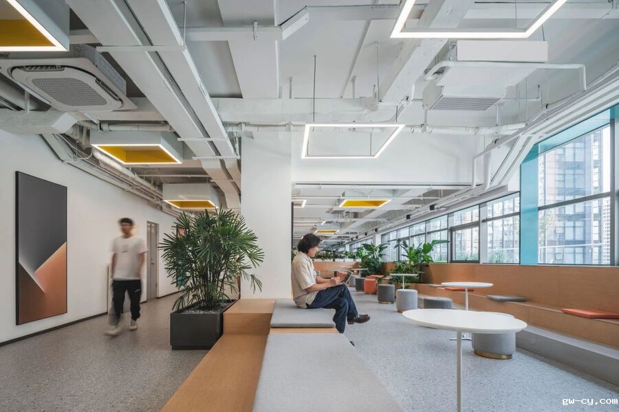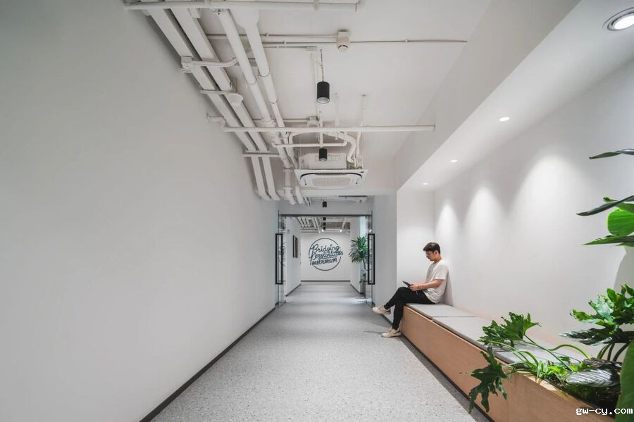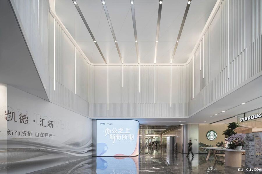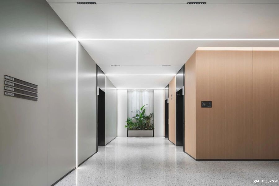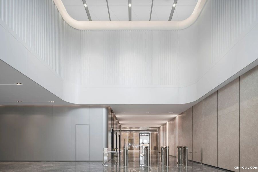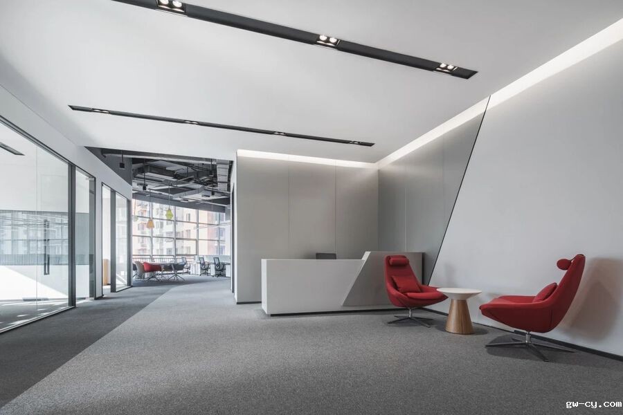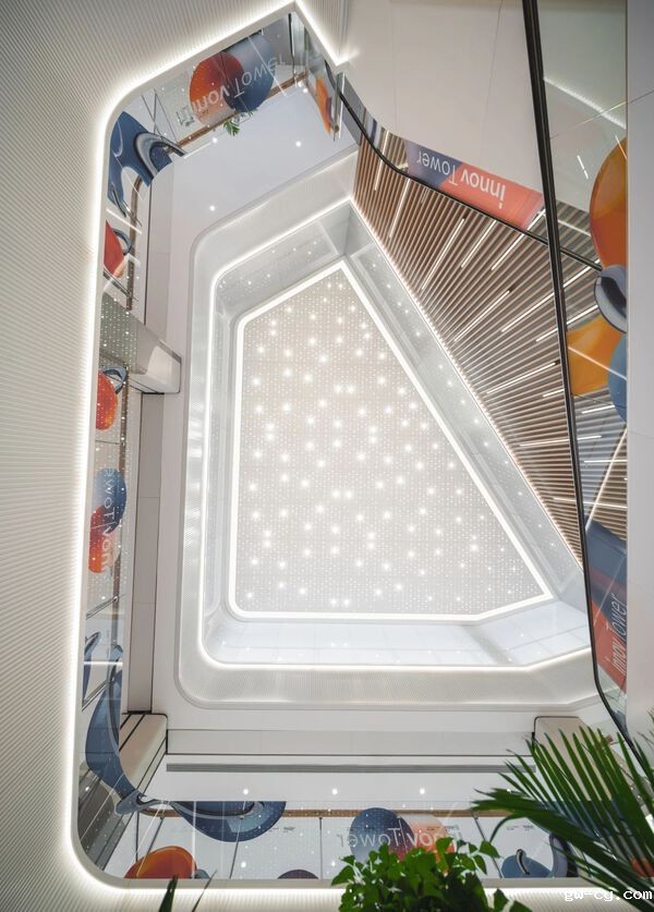 走进堂厅中庭,简洁明亮的办公区映入眼帘。天花映射了建筑造型,线条走向与人流导向呼应,赋予空间动态节奏感的同时,起到视觉引导作用。