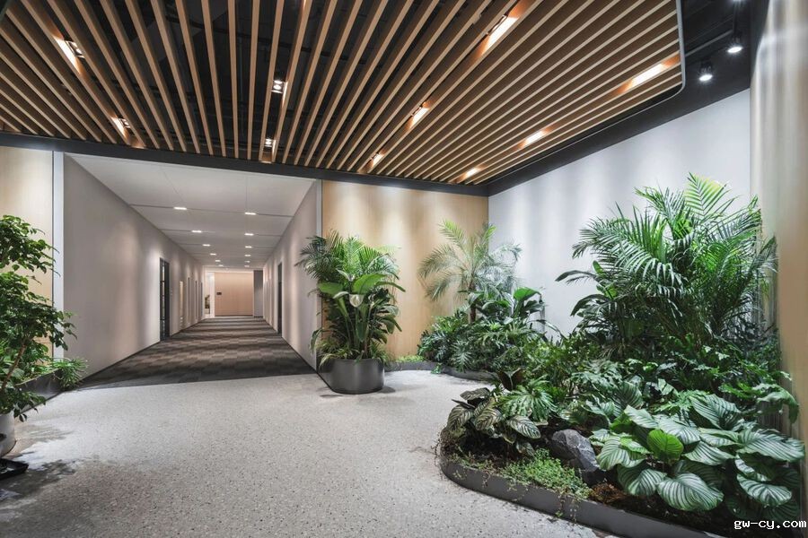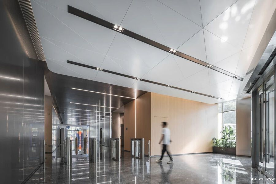 办公大堂引入自然光线和室内绿植,降低了办公空间的冰冷感。J&A将门厅顶部不规则的造型进行艺术重塑,棱角感的线条,简约又不失力量,勾勒出一个现代感的空间轮廓。