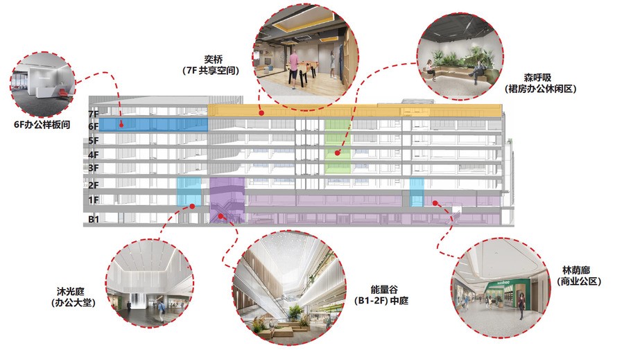 最引人注目的无疑是横跨三座裙楼的阶梯式开放空间——奕桥Bridge+ Lounge楼宇会客厅。这一设计以“共享和连结”为核心理念,2000㎡的广阔空间,为各类型的企业敞开了一扇通往多元、创新、灵活服务的大门。