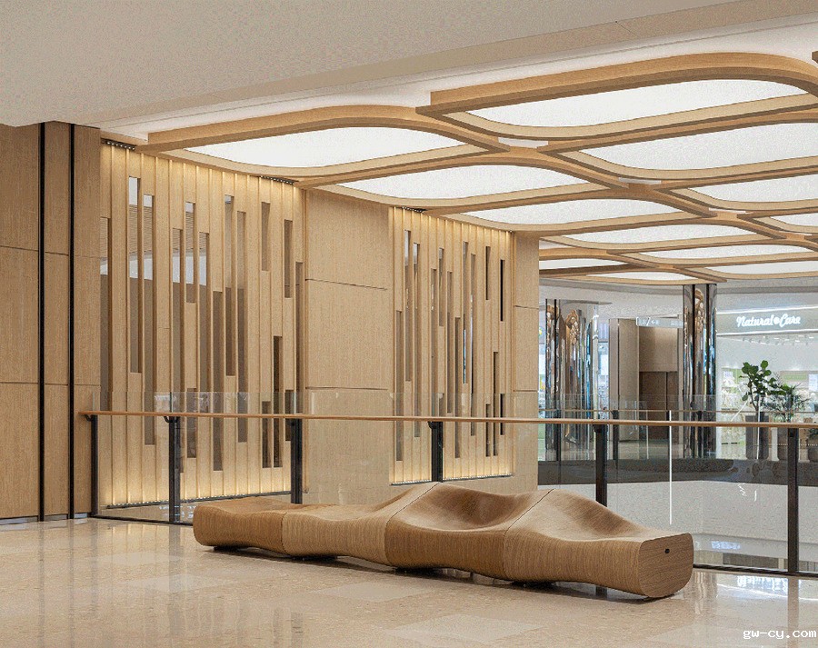 主要材料:木纹铝板、古铜色铝板、肌理涂料、灰色石材、水磨石、不锈钢、玻璃钢、鲜活绿植等