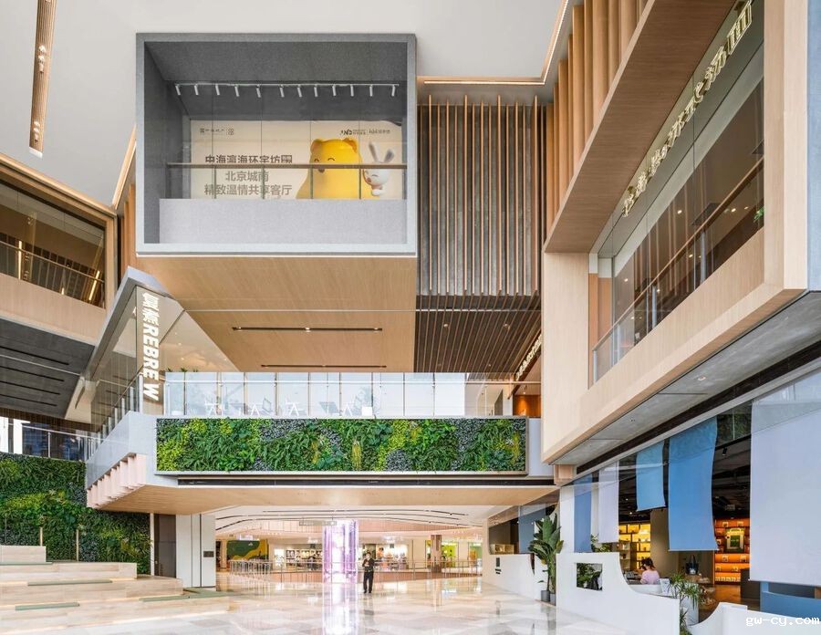 各层地面、中庭拦河以及屋顶均布置了真实绿植,营造出一片生态花园。在扶梯底部、卫生间和电梯厅等特色区域,108个富有深意的英文单词拼凑成“UNWORLD”,将壹方天地的企业文化与生态城市的理念完美融合,营造出一个充满趣味、情感和温暖的街区花园。