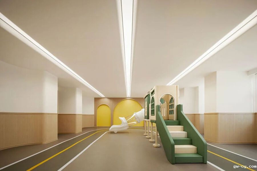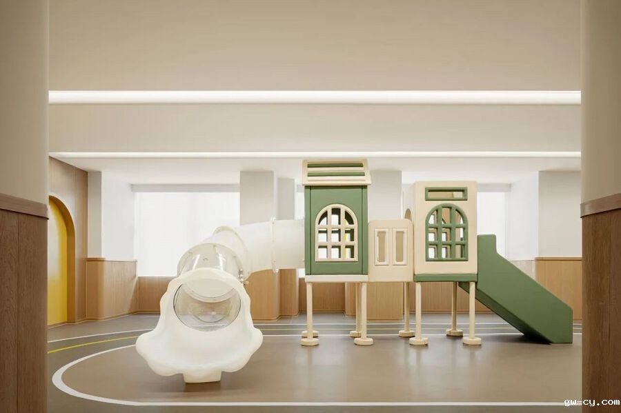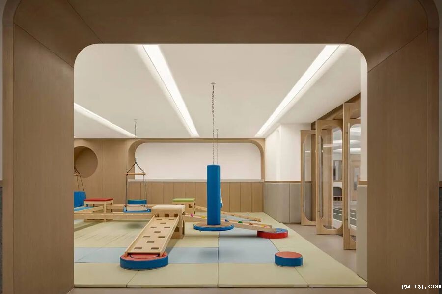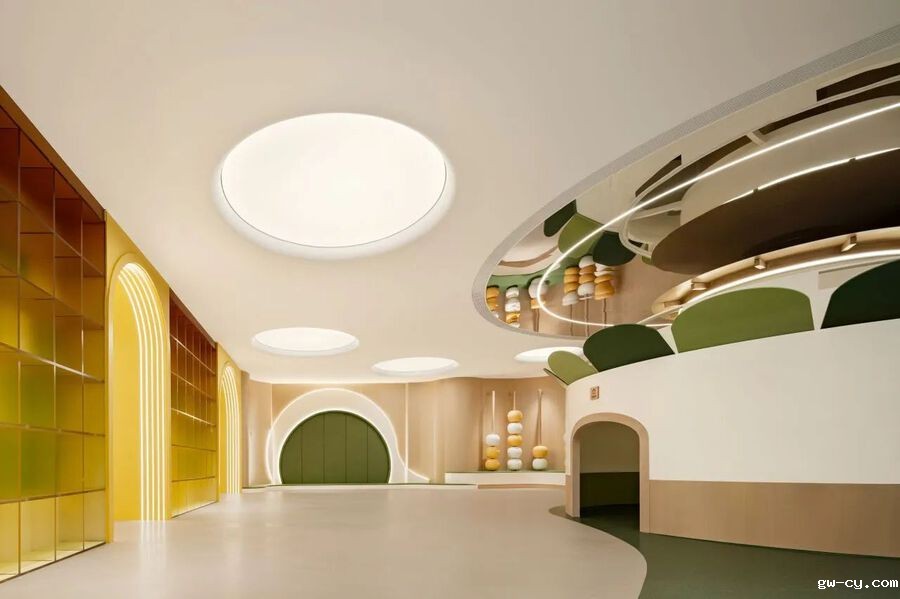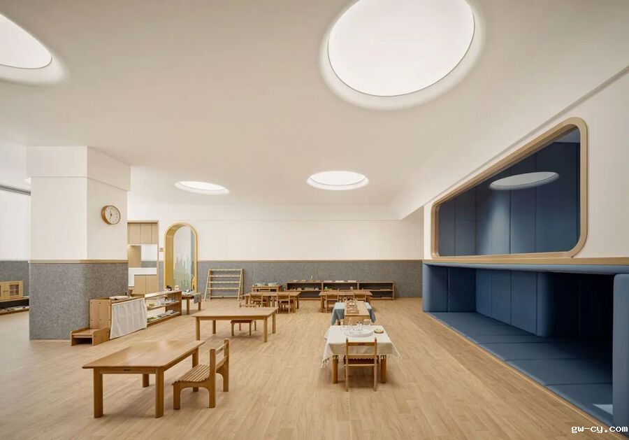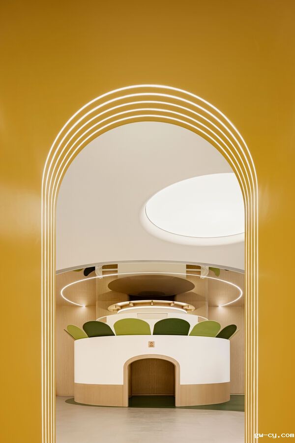 移步左侧的多功能活动室,空间处处都运用了圆弧元素,不同的角落里设置了游乐、阅读等功能区域,增加场所趣味性的同时,保证了内部空间的宁静。