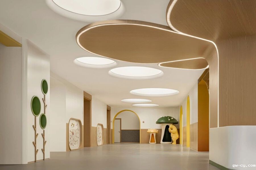 J&A在立面提升及室内设计中引入“天圆地方”的设计理念,通过灵活的空间布局,搭配中国传统色彩元素与贴心设施,为孩子们提供了一个温馨、安全且富有启发性的成长空间。