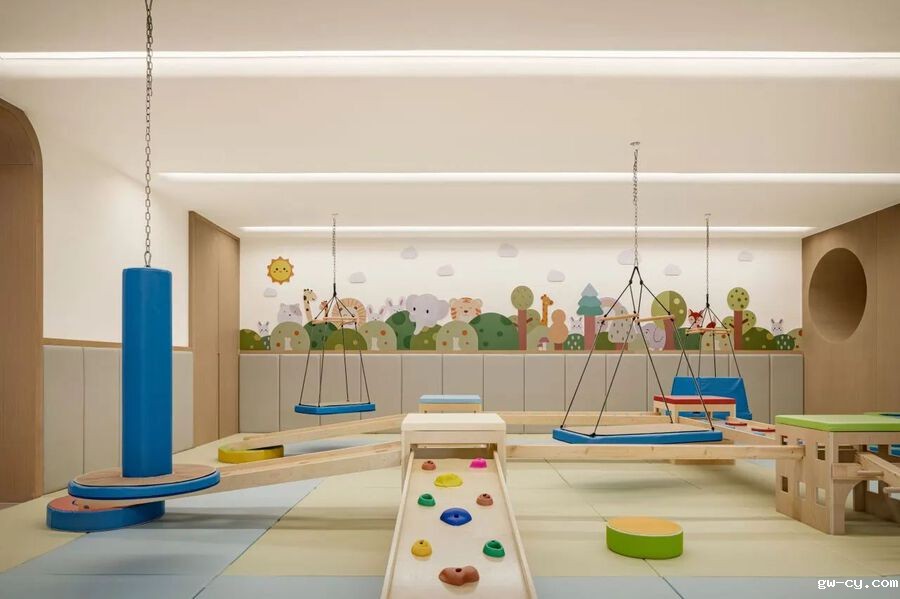 托育中心公共区域主要由接待前厅、多功能活动室、半户外活动区等组成。