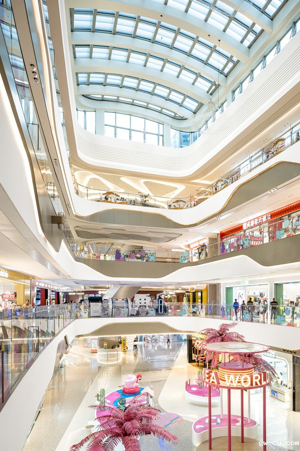 东中庭的设计与主中庭相呼应,同样采用了浮岛挑台,巧妙地弱化了中庭洞口处较为明显的轮廓线。