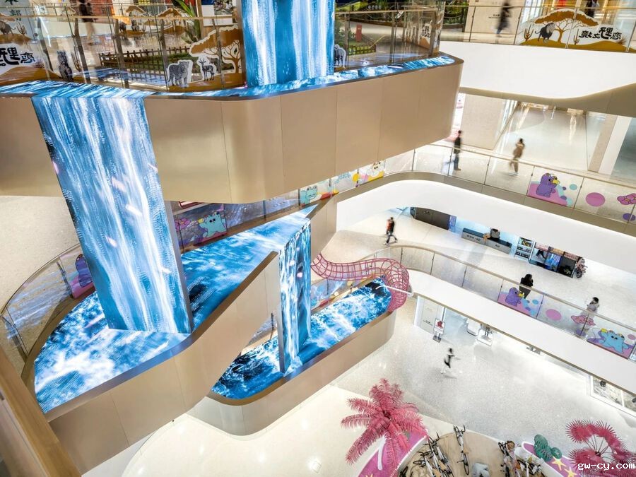 同时,在挑台植入Led屏幕模块,创造一道近20米的室内瀑布。这道瀑布连跨三层,倾泻而下,为整个空间注入强烈的动感,营造出一种震撼人心的视觉体验。