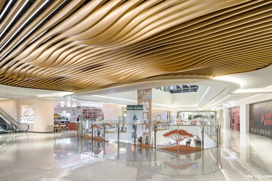 4层美食区以海浪为设计符号,捕捉水波荡漾的韵律,将其凝固并固定,形成独特的视觉体验。曲度各异的线条交错汇集,海浪交叠,赋予空间奔腾流动的生命力。
