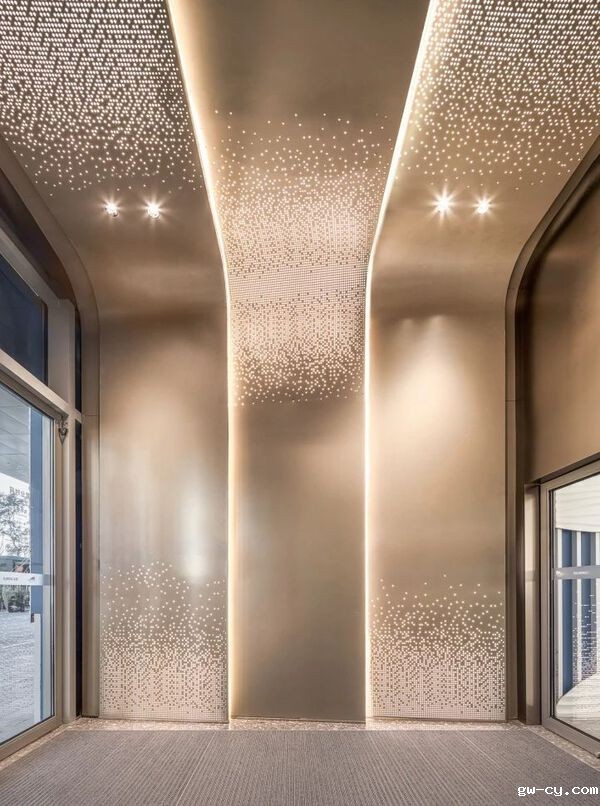 主入口延续建筑外观的流线型设计,夜幕降临后,数百根金色铝管在灯光照射下熠熠生辉,为入口增加了韵律感与层次感。