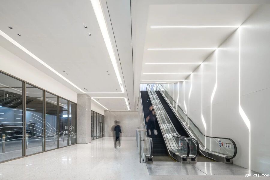 对于商业空间来说,反复的视觉符号植入可以帮助商场构建鲜明的商业辨识度。J&A在常被忽略的地下光厅、电梯厅等区域同样也嵌入海浪线条,从而形成连贯统一的视觉感受。