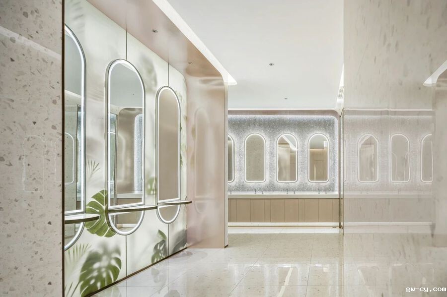 J&A打破大众对卫生间的常规认知,为顾客带来全新的叙事空间与情绪感受。在女卫洗手台区域,墙面以波浪纹理的灰色人造石为装饰,化妆台墙面则使用了高清图案的艺术玻璃,恍惚置身于自然之中。
