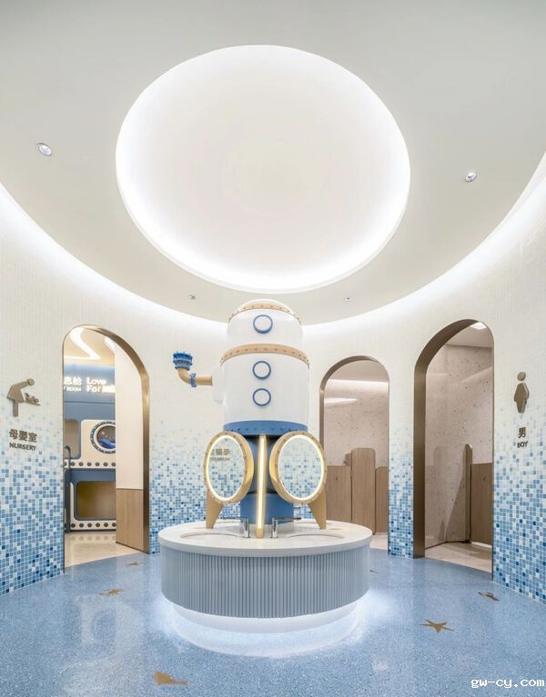儿童卫生间的弧形墙面为孩子们提供了充足的安全感。还有各种可爱的设计元素,比如洗手台上的卡通潜艇、墙面蓝白渐变的小马赛克瓷砖、地面的海洋生物图案,都在激发着孩子们探索海洋的兴趣。