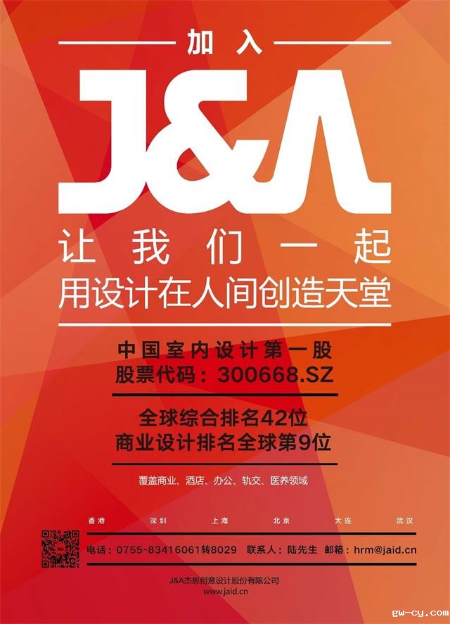 深圳市杰恩创意设计股份有限公司(简称“J&A”)是目前亚洲最大的室内设计公司之一,作为第一家登陆A股市场的室内设计企业(股票代码:300668.SZ),在美国室内设计权威杂志《INTERIOR DESIGN》2017设计巨头排行榜中,全球综合排名42位,商业设计排名全球第9位,是年度唯一入选的国内设计机构。