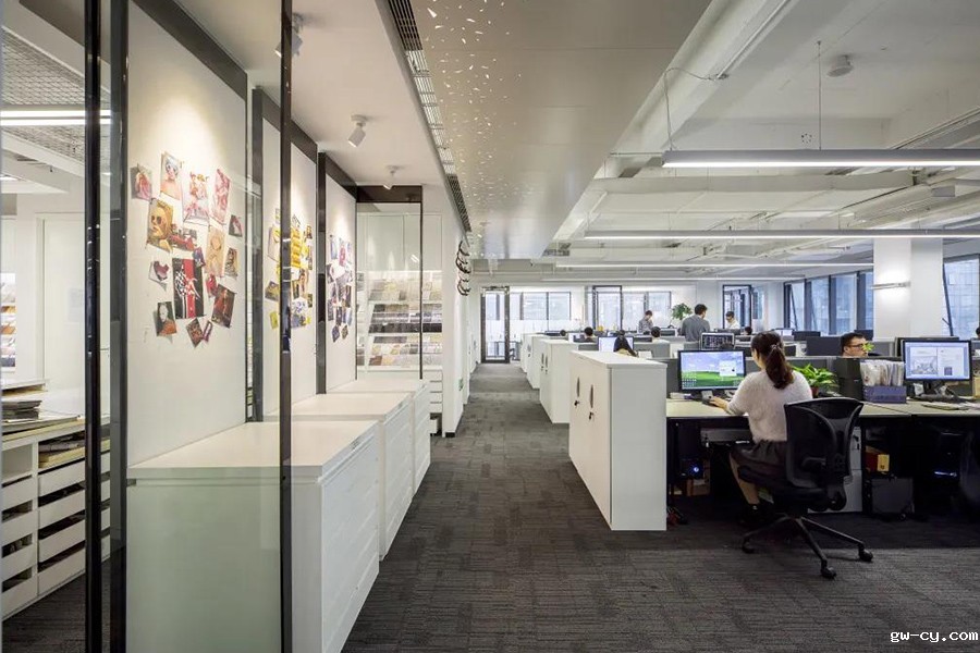 室内照明不采用裸灯,照度满足400Lux,保证70% 工位距离室外窗的距离小于7.5m。