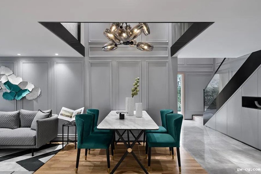 欧式线条烤漆板、爵士白石材的灰系、淡雅,以及在不同区域串联的一抹浪漫绿调,共同拼凑出一份时尚摩登的空间与生活映像。