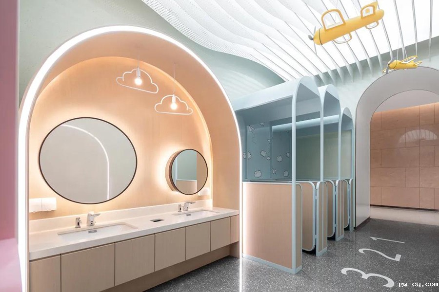 此外,节能措施、可循环材料的使用营造出相对绿色健康的空间环境。人性化的空间设计更是给人轻松、舒适而便捷的感受。私密安全的母婴室,色彩缤纷且充满童趣的儿童卫生间,多元的休息区和打卡区等,为项目注入亲和力,让人体会到细致入微的关怀和舒适惬意的购物体验。
