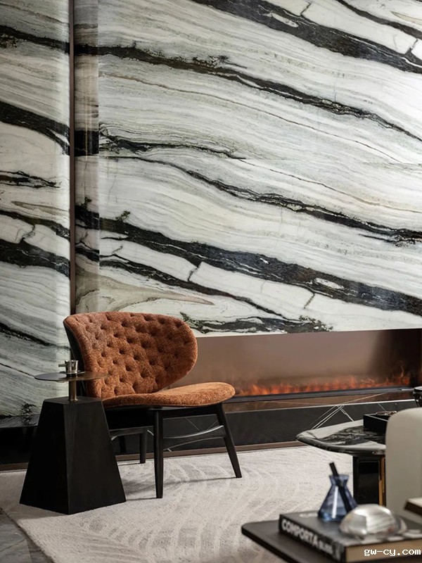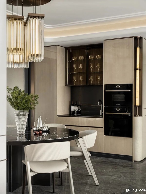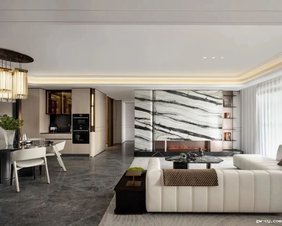 主要材料:拉图白大理石、宇宙金大理石、古铜金不锈钢、木饰面
