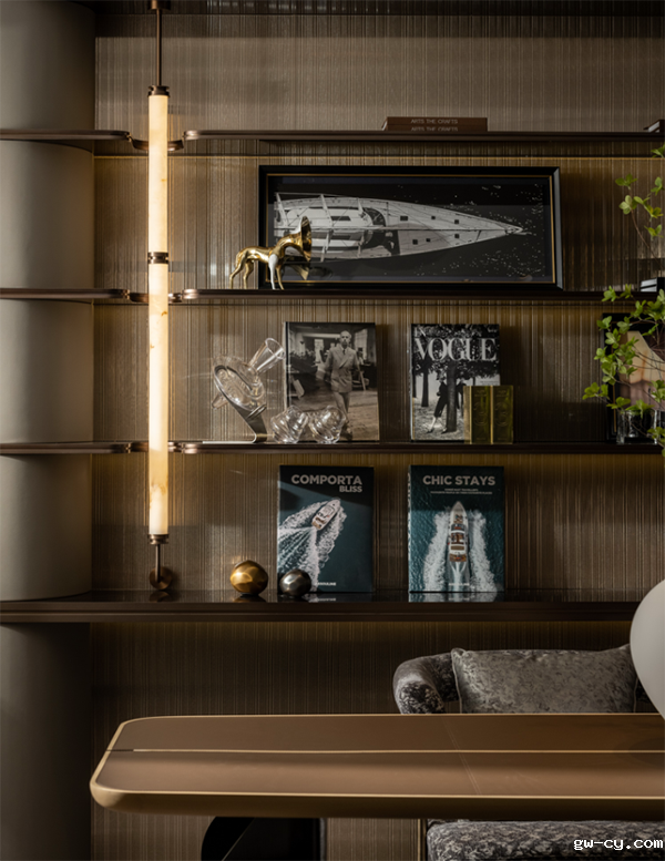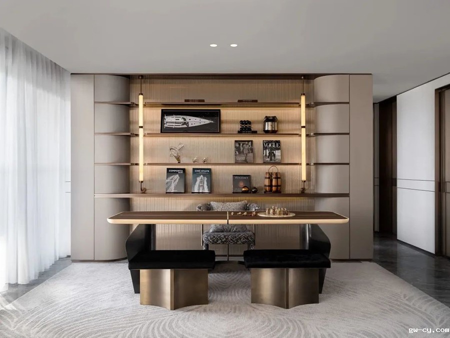 轻松惬意的阅读空间与会客空间贯穿融合,光线透过纱帘,在空间里自由蔓延,赋予空间更强的层次感。