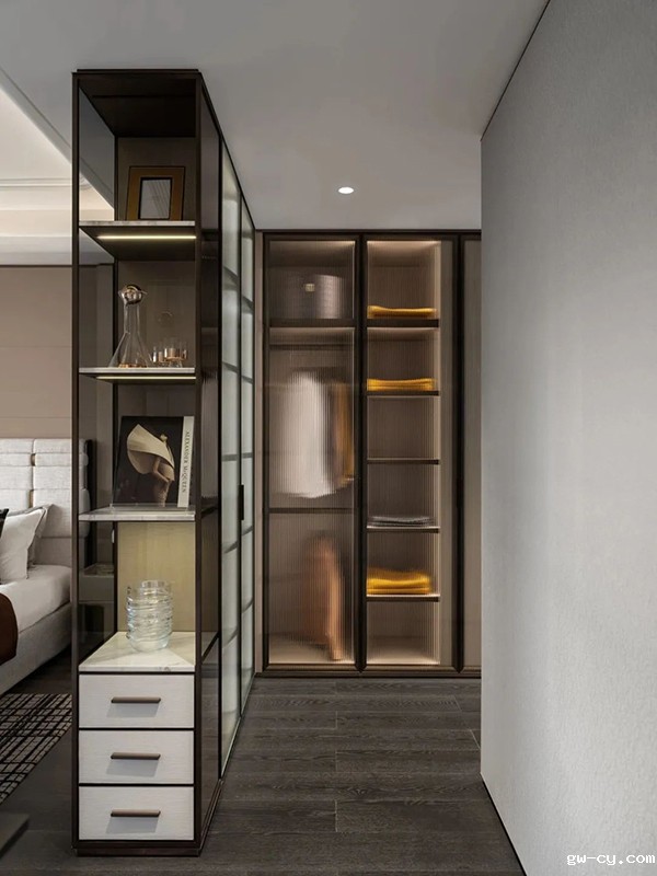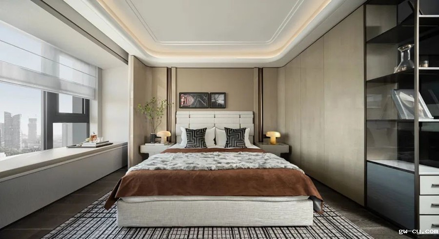 次卧静谧舒雅,以沉稳的色彩、简约的线条渲染出一片安宁之地。于优雅惬意中透露出岁月的宁静。